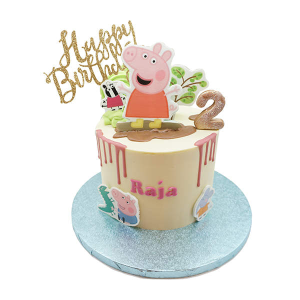 Hell eingestrichene Torte mit Peppa Wutz in der Hauptrolle, dekoriert mit einer Landschaft aus Bäumen und Sträuchern, einer Matschpfütze und einem rosa Drip. Peppa`s Freunde runden das Gesamtbild ab. Für die individuelle Note sorgen der eigene Name und die Jahreszahl.
