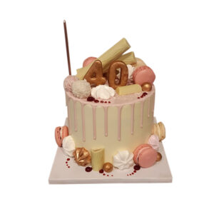 Hell eingestrichene Torte für Schokofans, versehen mit zartbitter Drip und dekoriert mit allem, was das Schokoladenregal hergibt.