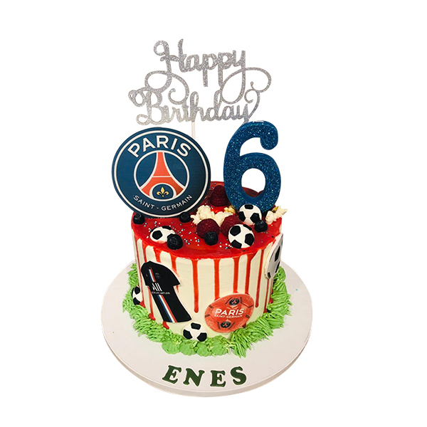 Fussballtorte für St.Gerrmain Fans! hell eingestrichen mit rotem Drip und aufgespritztem Gras, dkoriert mit Fußbällen, Trikot und Logo der Lieblingsmannschaft!